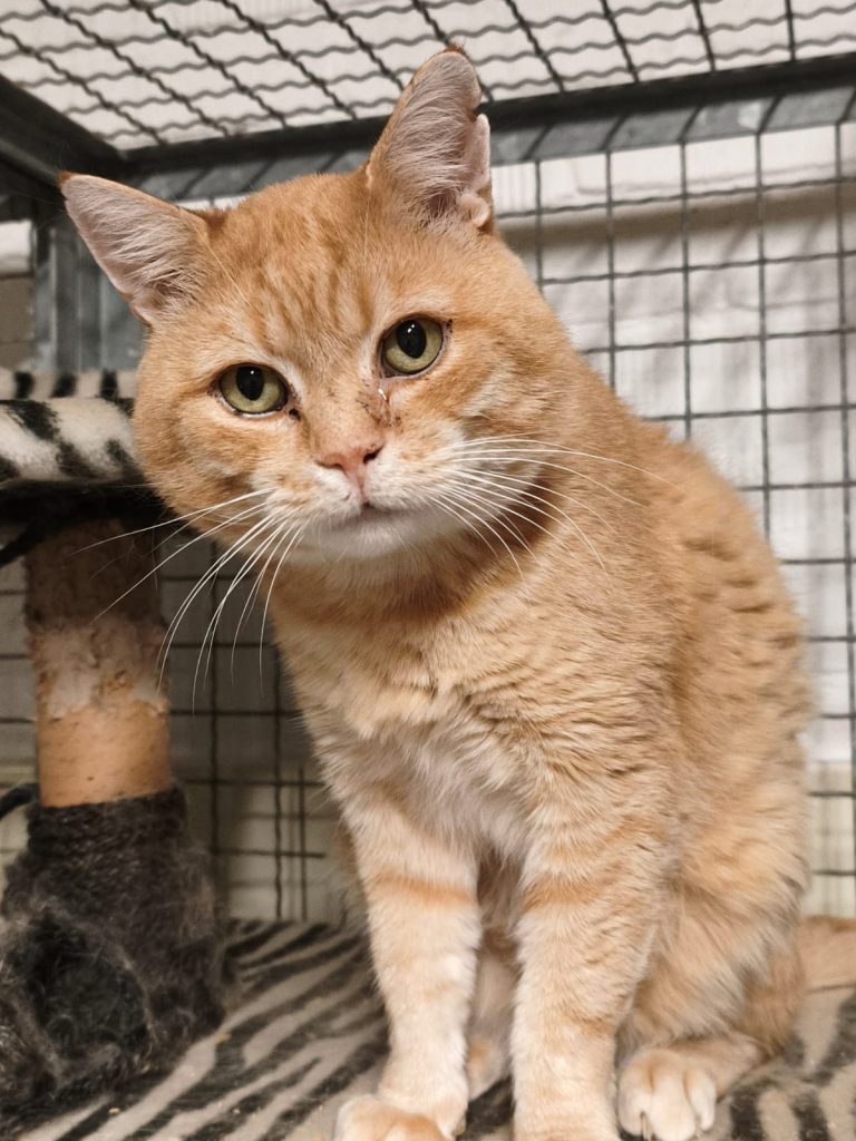 Er hat eine chronische Niereninsuffizienz und benötigt dauerhaft Spezialfutter. Außerdem hat er chronischen Katzenschnupfen. Dies ist ein altes, nicht ansteckendes Problem. Es kann sein, dass er hin und wieder nießt und seine Popel verliert, aber dies beeinträchtigt ihn nicht.
