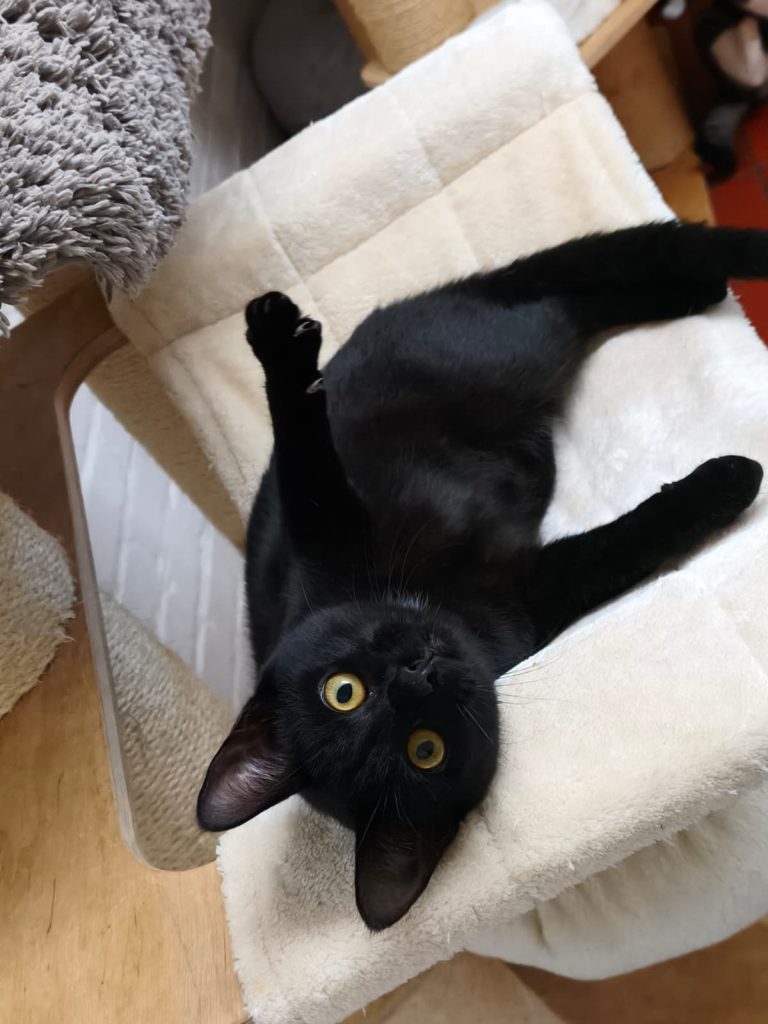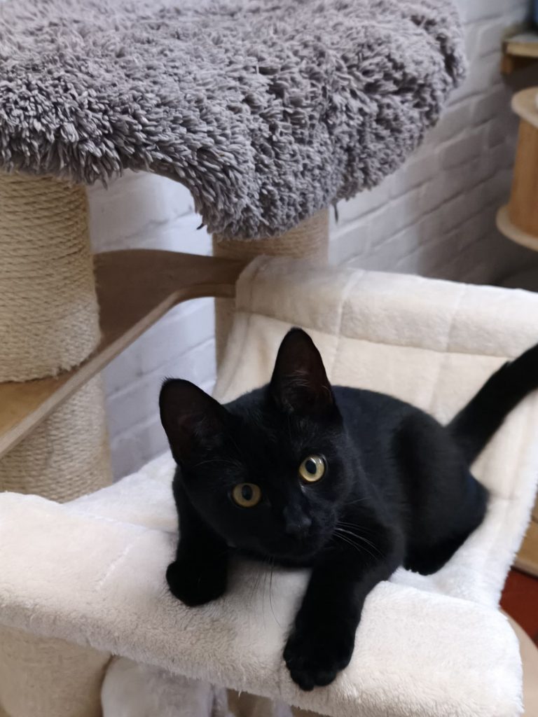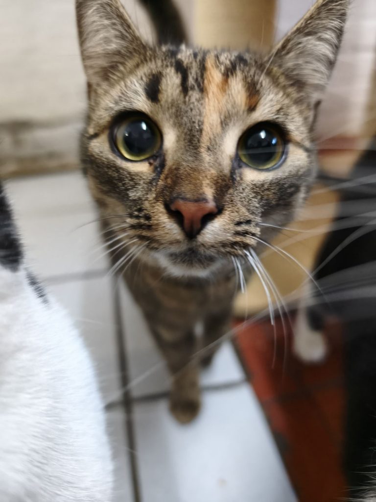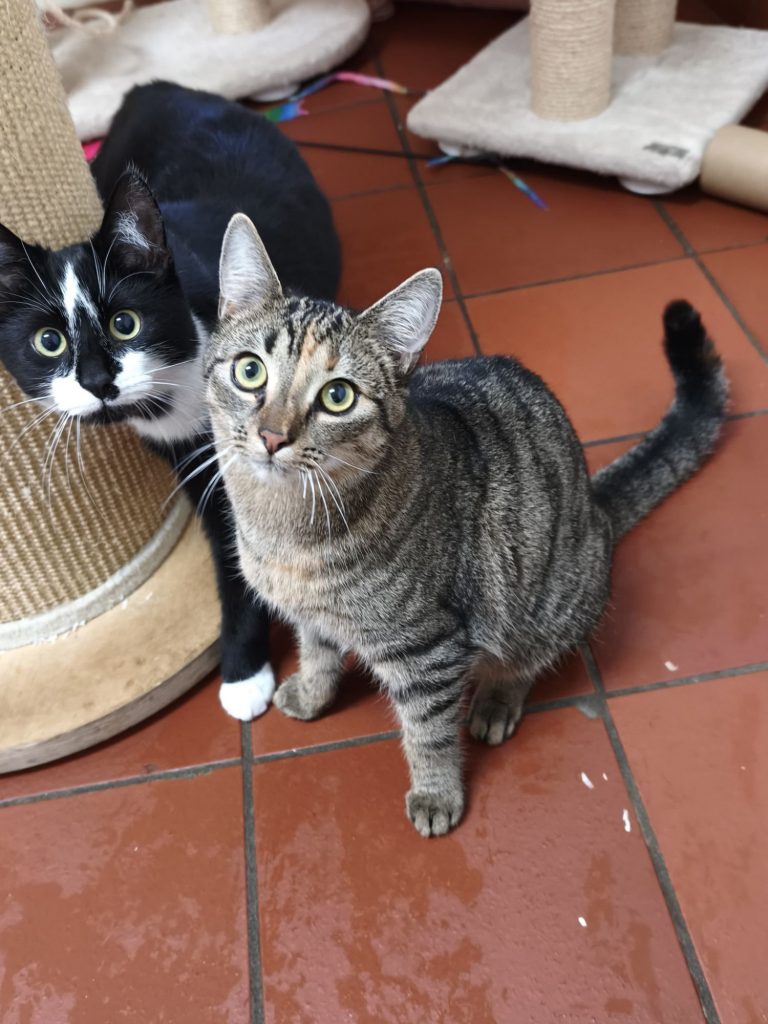 Die beiden kamen unabhängig voneinander als Jungkatzen zu uns ins Tierheim. Da geteiltes Leid bekanntlich halbes Leid ist, haben wir sie zusammengesetzt. Anfangs herrschte noch „Zickenterror“ und man war sich gar nicht grün. Doch nach nur wenigen Tagen platzte der Knoten, sie wuchsen zusammen und heute sind sie wie Pech und Schwefel.