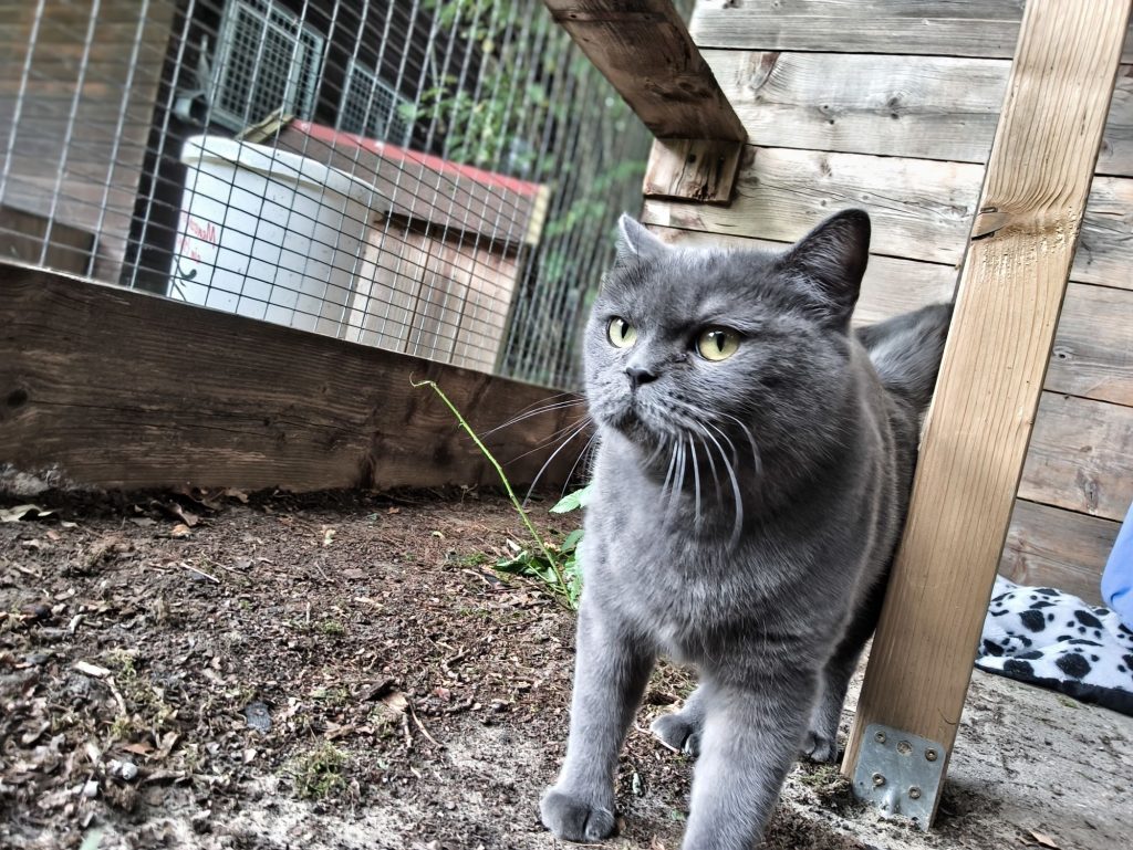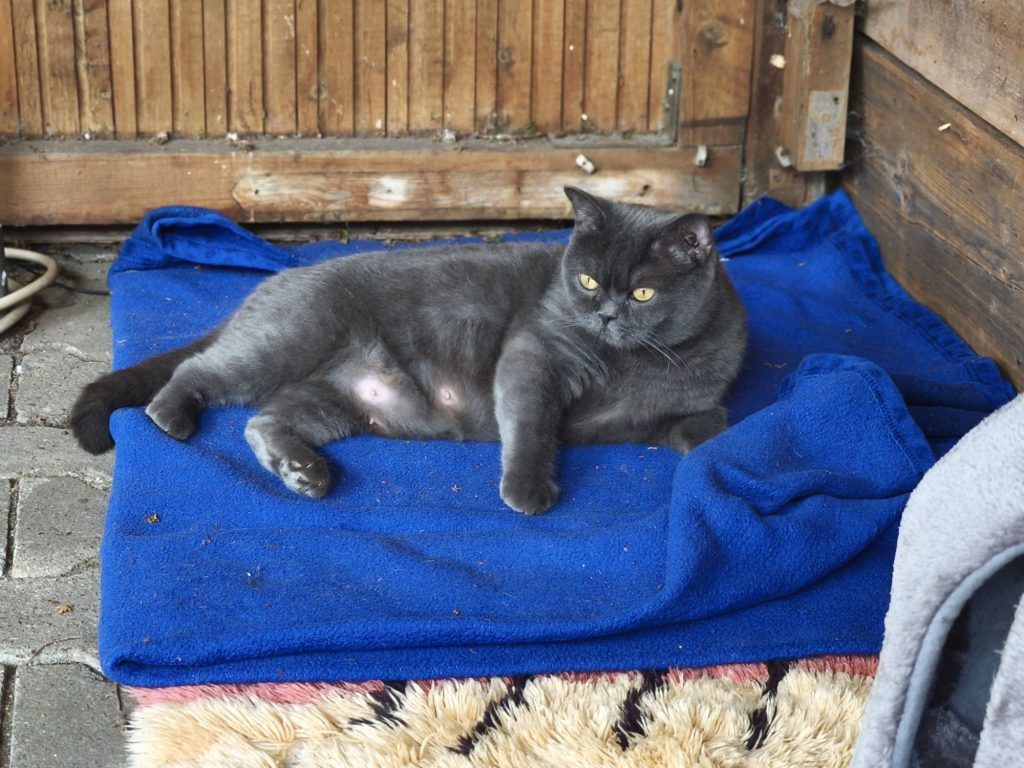 Das ist Motzi. Die Britisch Kurzhaar-Dame kam mit einem Darmvorfall zu uns, der sich wie durch ein Wunder auf dem Weg zur Tierärztin von selbst zurückzog. Motzi hatte bei Einlieferung außerdem ein aktives Gesäuge, doch ihre Babys waren nicht auffindbar. Zufälligerweise war eine andere Katzenmama mit ihren frisch geborenen Welpen überfordert. Eine glückliche Fügung für alle Beteiligten. So zogen die zwei kleinen Kitten E.T. und Giselle bei Motzi ein und wurden von ihr sofort als eigene Babys angenommen.