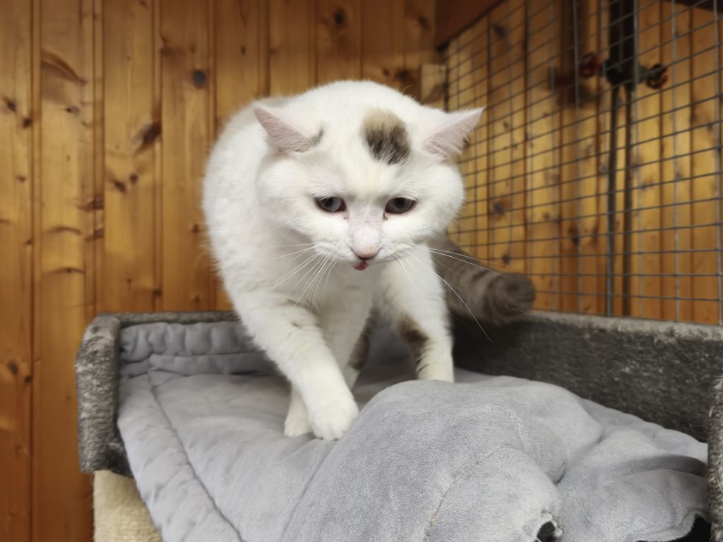 Das ist Snowball, ein britisch Kurzhaar (BKH) Traumkater, wie er im Buche steht. Geboren wurde der hübsche Kerl etwa 2022 und er macht seinem Namen mit seinem hellen Fell und den strahlend blauen Augen alle Ehre. Das optische Highlight ist aber zweifellos der putzige dunkle Fleck auf seiner hellen Nase, ein ganz individuelles Markenzeichen, das ihn einfach unverwechselbar macht.